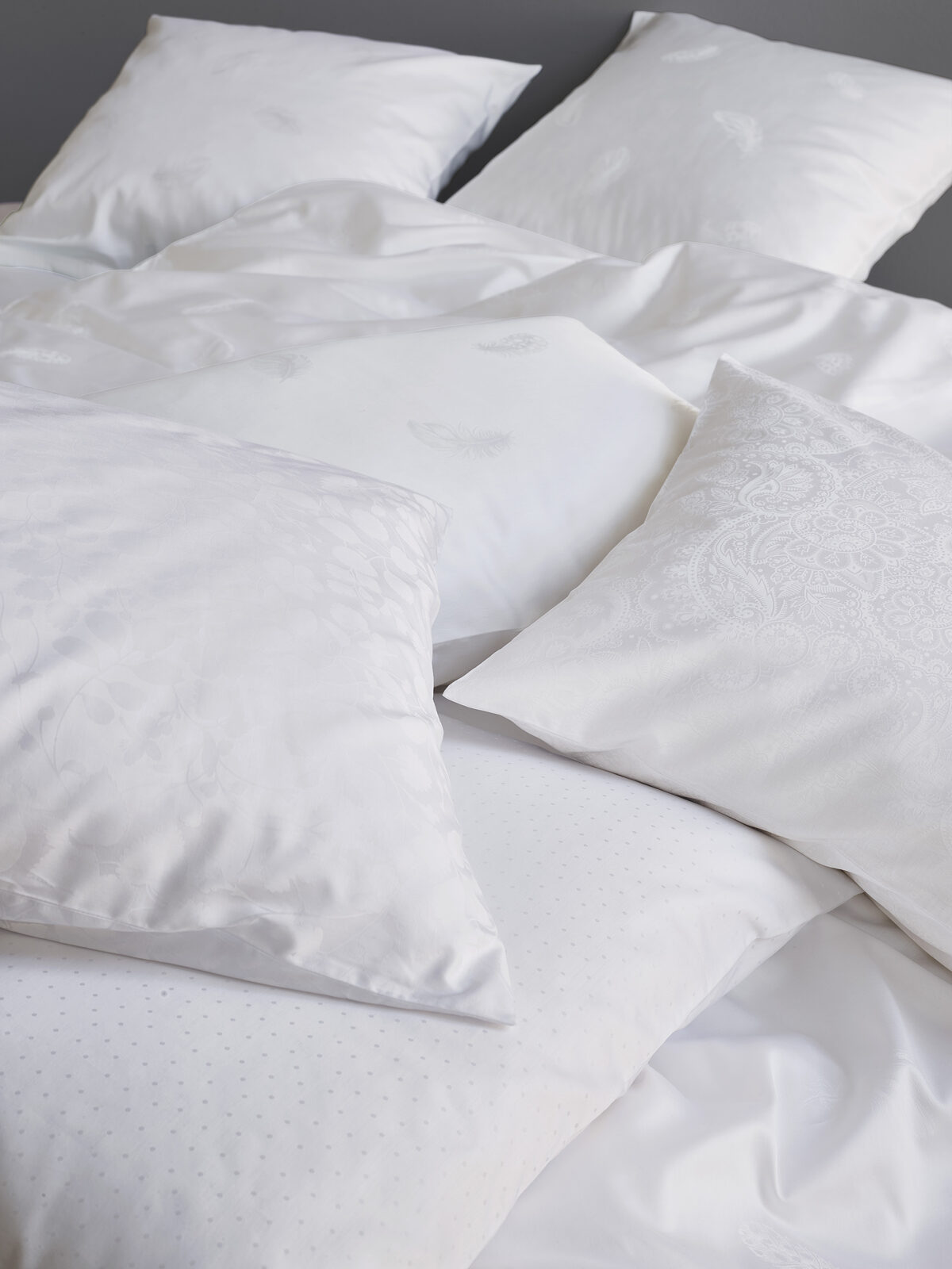 Hochwertiges, stückgefärbtes Jacquard-Gewebe aus 100% Baumwolle. Jacquard-Gewebe sind Stoffe mit formenreichen, eingewobenen Mustern. Die Musterungen beim Satin Exquisit entstehen durch das Abwechseln von Kett- und Schussfäden und treten je nach Lichteinfall reliefartig glänzend hervor (ca. 110 g/m2).