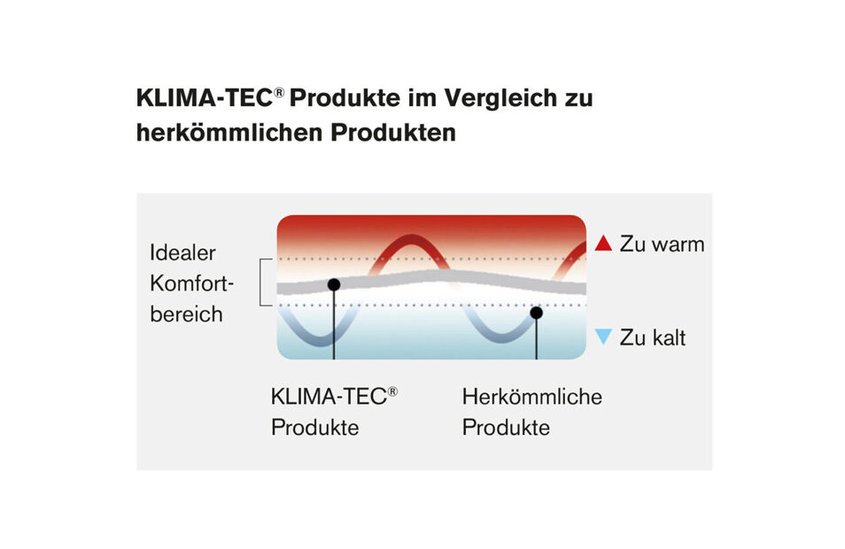 Hier wird die allerneuste Temperatur regulierende PCM-Technologie (Phase Change Material) aus der NASA-Weltraumforschung genutzt und in den hochwertigen, sehr anschmiegsamen KLIMA-TEC* Duvets, Kissen und Matratzeneinlagen eingesetzt. Diese Produkte helfen Ihnen, dass Sie nie mehr frieren oder zu schwitzen. Der Körper kann sich während den wichtigen Ruhephasen erholen und neue Energie für den kommenden Tag sammeln.
